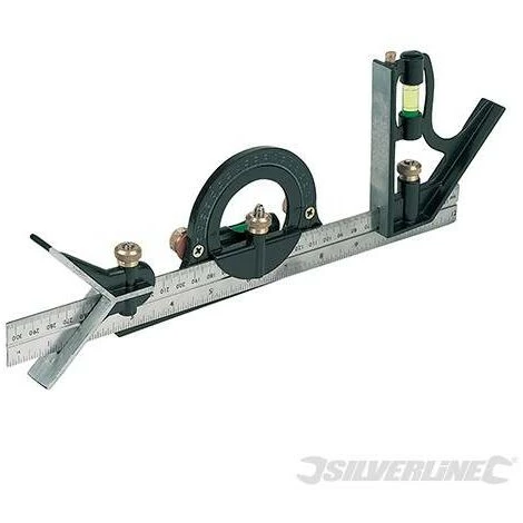 Équerre multifonction : trusquin Ă tracer et jauge de profondeur, Ă©querre d’onglet et règle. Lame en acier inoxydable de 300 mm pourvue de graduations mĂ©triques et impĂ©riales. Rapporteur 180° et tĂŞte de centrage en aluminium. Vis moletĂ©e en laiton pour un rĂ©glage facile. Comprend pointe Ă tracer et fioles.