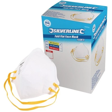 Masque protecteur FFP1 NR. Offre une protection contre les poussières fines, fibres non toxiques et brouillards aqueux jusqu’Ă un facteur 4. Usage unique. Conforme Ă la norme EN149:2001+A1:2009.