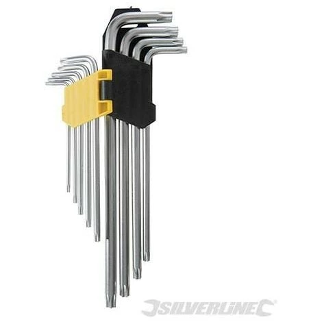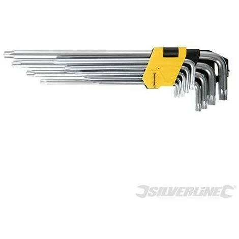 9 clés Trx en acier chrome-vanadium trempé. Tailles fournies : T10, T15, T20, T25, T27, T30, T40, T45 et T50. Support de rangement fourni.