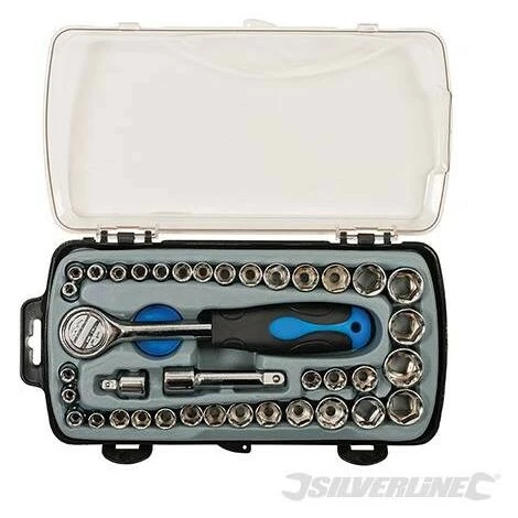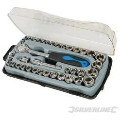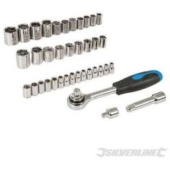 Douilles 1/4″ : AF 5/32″, 3/16″, 7/32″, 1/4″, 9/32″, 5/16″, 11/32″, 3/8″, 13/32″, 7/16″, 15/32″, 1/2″ et 17/32″. MĂ©triques : 4, 4,5, 5, 5,5, 6, 6,5, 7, 8, 9, 10, 11, 12 et 13 mm. Double carrĂ© : 1/4″, 5/16″ et 3/8″. Douilles 3/8″ : AF 9/16″ et 5/8″. MĂ©triques : 14, 15, 16 et 17 mm. Adaptateur 1/4″ – 3/8″, rallonge 3/8″. Rochet anti-retour. PoignĂ©e de clĂ© Ă cliquet caoutchoutĂ©e 3/8″. Coffret de rangement.