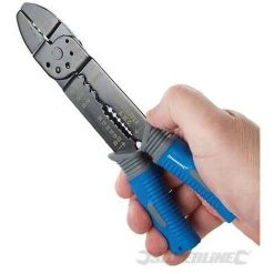 Pince en acier embouti et durci. Fonction pince à dénuder pour fils de 0,75 ; 1 ; 1,5 ; 2,5 ; 4 et 6 mm². Fonction pince à sertir pour cosses isolées et non isolées de 1,5 ; 2,5 et 6 mm². Guide des tailles de boulons : M2,6 ; 3 ; 3,5 ; 4 et 5. Comprend aussi attaches, piques mâles et femelles, œillets et cosses pour épissures (1,5 et 2,5 mm).