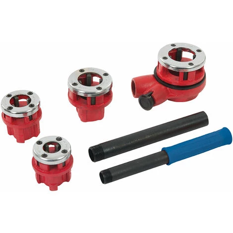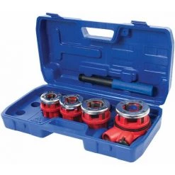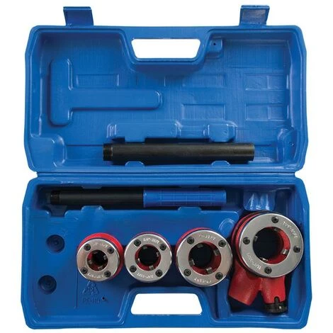 Le coffret comprend 4 filières de différentes tailles : BSPT 1/2”, 3/4”, 1” et 1-1/4” (13, 19, 25 et 32 mm).