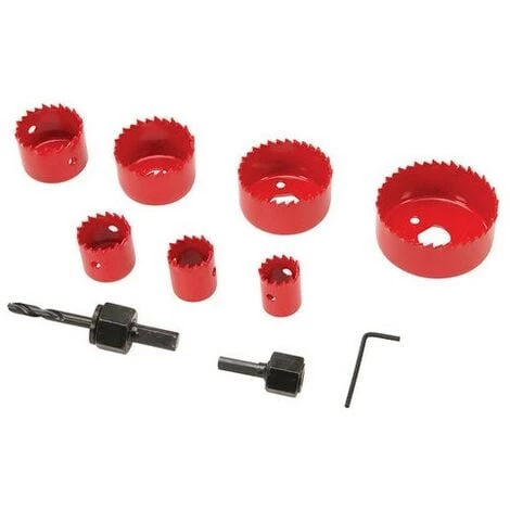 Comprend les tailles de 21, 25, 29, 38, 44, 51 et 64 mm, foret de centrage, 2 arbres et clé 6 pans. Vitesse maximale 1500 tr/min.