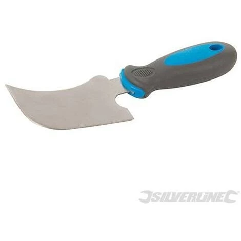 Lame en acier en forme de croissant. Poignée caoutchoutée ergonomique bicolore. Pour retirer les baguettes de fenêtres et de portes en PVC. Pour vitrage, fenêtres, parquet et autres applications. Lame de 100 mm.