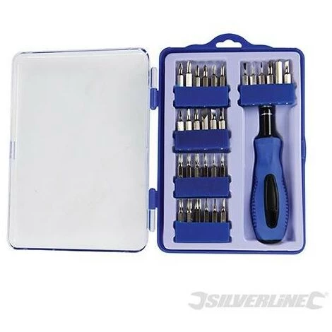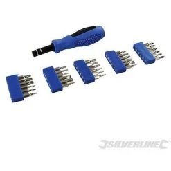 Ensemble comprenant l’essentiel des embouts de prĂ©cision les plus communĂ©ment utilisĂ©s et un manche caoutchoutĂ©. Embouts plats 1 ; 1,5 ; 2 ; 2,5 ; 3 ; 3,5 et 4 mm ; Phillips PH000, PH00, PH0 et PH1 ; Pozidriv : PZ0 et PZ1 ; Hexagonaux 0,7 ; 0,9 ; 1,3 ; 1,5 ; 2 ; 2,5 ; 3 et 4 mm ; Trx T4, T5, T6, T7, T8, T9, T10, T15 et T20. PrĂ©sentĂ©s dans un coffret compartimentĂ© très pratique.