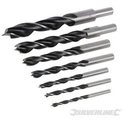 Jeu de forets à pointe et double tranchant pour toutes applications bois. Tailles 4, 5 ,6, 8, 10, 13 et 16 mm. Tailles spécialement choisies pour compatibilité avec le jeu de 4 coupe-bouchons Silverline.