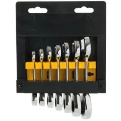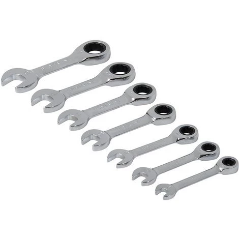 En chrome-vanadium trempé et revenu , acier allié 40 Cr. Clé à cliquet très courte pour travailler dans les endroits exigus. Angle de reprise sur 8°. Entièrement poli miroir. Taille : 8, 10, 11, 13, 14, 17 et 19 mm.
