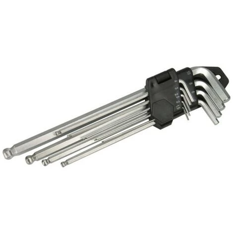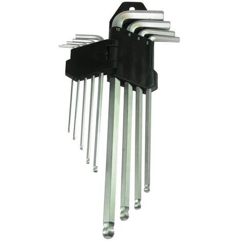 Clés 6 pans à tête sphérique en acier nickelé, finition satinée. Tailles : 1,5, 2, 2,5, 3, 4, 5, 6, 8 et 10 mm. Clip de rangement.Clés 6 pans à tête sphérique en acier nickelé, finition satinée. Tailles : 1,5, 2, 2,5, 3, 4, 5, 6, 8 et 10 mm. Clip de rangement.Clés 6 pans à tête sphérique en acier nickelé, finition satinée. Tailles : 1,5, 2, 2,5, 3, 4, 5, 6, 8 et 10 mm. Clip de rangement.