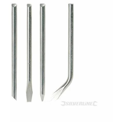Comprend 1 panne courbée, 1 panne biseautée, 1 panne pointue et 1 panne plate. Compatible avec les fers a souder Silverline de 60 W ou de 100 W (633838 et 868784).