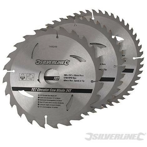 3 lames de scie circulaire pour la coupe du bois dur, bois tendre, panneaux de particules et autres matériaux composites. Acier trempé et renforcé pour une durabilité accrue. 24, 40 et 48 dents.
