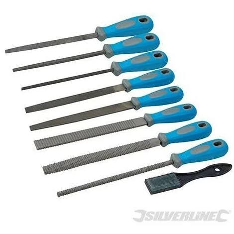 Râpes 200 mm (plate, demi-ronde et ronde) et limes 200 mm (plate, demi-ronde, queue-de-rat, triangulaire et carrée). Comprend brosse de nettoyage et trousse nylon.