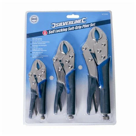 Assortiment de 3 pinces étaux autobloquantes en acier nickelé, mâchoires incurvées, ouverture réglable et poignées confort.