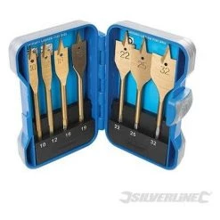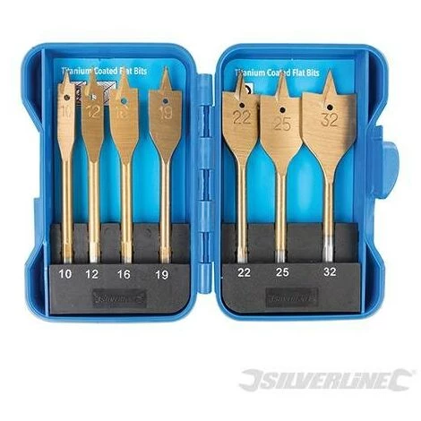 Mèches plates titanées en acier à haute teneur en carbone pour le perçage dans le bois, les matériaux composite et le plastique. Fournies dans un boîtier de rangement pratique. Compatibles avec tous les mandrins à 3 mors de 13 mm. Tailles fournies : 10 mm, 12 mm, 16 mm, 19 mm, 22 mm, 25 mm et 32 mm.