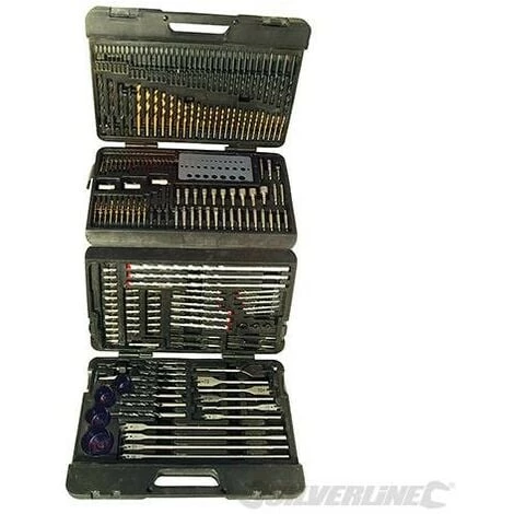 51 forets acier rapide titanés, 42 forets acier rapide finition noire, 14 forets de maçonnerie, 18 forets à bois, 3 forets de centrage, 47 embouts de vissage, 10 tourne-écrous, 3 butées de profondeur, 4 scies-cloches, 1 adaptateur à scie-cloche, 3 chasse-clous, 3 guide-vis, 1 pointeau, 1 fraise conique, 1 jauge à trous, 1 porte-embout et 1 clé mâle.