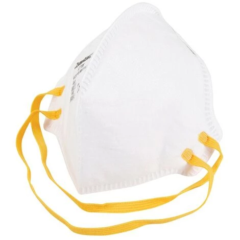 Masque protecteur FFP1 NR. Offre une protection contre les poussières fines, fibres non toxiques et brouillards aqueux jusqu’Ă un facteur 4. Usage unique. Conforme Ă la norme EN149:2001+A1:2009.
