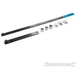 En acier au carbone chromé et peint par poudrage pour résistance à la corrosion. Pour relâcher et tendre les courroies trapézoïdales dans des endroits confinés très exigus. Poignée extra-longue de 585 mm avec rallonge de 220 mm. Comprend douilles peu profondes de 15, 16 et 18 mm et clés de 13, 14 et 15 mm.