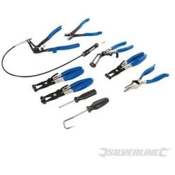 Pinces robustes en acier carbone avec poignĂ©es ergonomiques trempĂ©es vinyle. Conçues pour la dĂ©pose de colliers de serrage de type variĂ© prĂ©sents sur diffĂ©rents systèmes de vĂ©hicules. MĂ©canisme Ă cliquet permettant de serrer la pince sans avoir Ă la tenir en main. Diamètres : 18 Ă 54 mm (11/16 to 2-1/2″). Le kit comprend une pince pour colliers auto-serrants, une pince pour colliers Ă ressort Ă mâchoires pivotantes, une pince pour colliers de durite Ă bande plate Ă mâchoires pivotantes, une pince pour colliers de soufflet de cardan, une pince de dĂ©pose de durite, un crochet Ă´te-tuyau et un tournevis double tĂŞte. PrĂ©sentĂ© dans une mallette rigide pratique.
