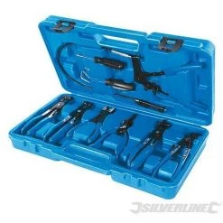 Pinces robustes en acier carbone avec poignĂ©es ergonomiques trempĂ©es vinyle. Conçues pour la dĂ©pose de colliers de serrage de type variĂ© prĂ©sents sur diffĂ©rents systèmes de vĂ©hicules. MĂ©canisme Ă cliquet permettant de serrer la pince sans avoir Ă la tenir en main. Diamètres : 18 Ă 54 mm (11/16 to 2-1/2″). Le kit comprend une pince pour colliers auto-serrants, une pince pour colliers Ă ressort Ă mâchoires pivotantes, une pince pour colliers de durite Ă bande plate Ă mâchoires pivotantes, une pince pour colliers de soufflet de cardan, une pince de dĂ©pose de durite, un crochet Ă´te-tuyau et un tournevis double tĂŞte. PrĂ©sentĂ© dans une mallette rigide pratique.