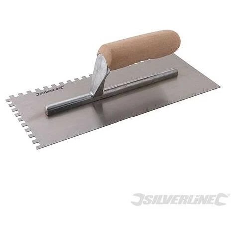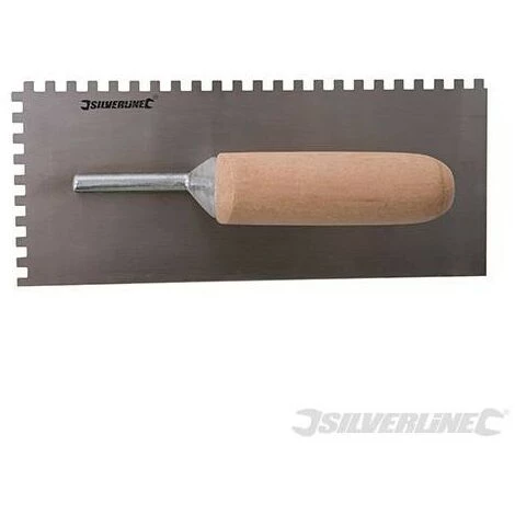 Lame en acier au carbone poli souple et poignĂ©e en bois lisse offrant un bon dĂ©gagement autour de la main. PoignĂ©e fixĂ©e par 8 rivets. Pour une application rapide et regulière d’adhĂ©sif pour la pose de carrelage, moquette, etc.