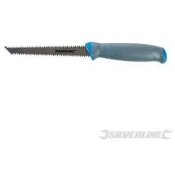 Lame en acier trempé à double tranchant, dents ultra acérées et extrémité pointue pour percer le plâtre. Manche poignard caoutchouté confortable. Idéale pour créer des cavités dans les plaques de plâtre pour les luminaires et prises électriques.