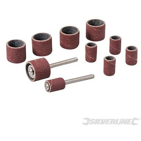 Tambours de ponçage en corindon pour la préparation des surfaces, le façonnage et le ponçage des métaux, alliages, céramique, carrelage, pierre, verre, plastiques et la fibre de verre. Compatible avec la plupart des outils rotatifs Silverline, GMC et Dremel. Fournis : 2 x tambours sur tige et 10 x manchons en corindon grain 80. Max. 28 000 min-1.