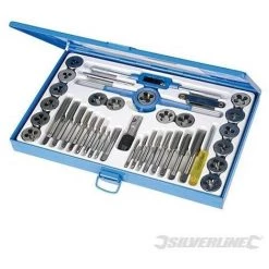 Ensemble de tarauds et filières en acier au tungstène massif, rangés dans un coffret métallique robuste. Tourne-à -gauche réglable à long manche. Porte-filière. Tournevis. Tourne-à -gauche en T. Tarauds et filières : M3 x 0,5 ; M3 x 0,6 ; M3,5 x 0,6 ; M4 x 0,7 ; M4 x 0,75 ; M5 x 0,8 ; M5 x 0,9 ; M6 x 0,75 ; M7 x 0.75 ; M6 x 1,0; M7 x 1,0 ; M8 x 1,0 ; M8 x 1,25 ; M10 x 1,25 ; M10 x 1,5 ; M12 x 1,5 et M12 x 1,75.