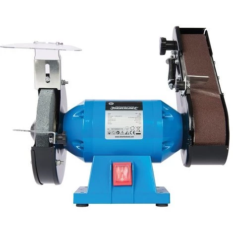 Appareil mixte touret de meulage 150 mm et ponceuse à bande. Bâti robuste en aluminium moulé et moteur à induction ultra-résistant à paliers étanches. Interrupteur étanche à la poussière et pieds caoutchoutés. Idéal pour le meulage des métaux et le ponçage de divers matériaux tels que le métal, le bois et le plastique. Vitesse à vide : 2950 tr/min (meule), 15 m/s (bande). Fourni avec : meule, bande de grain 80, 2 porte-outils, pare-étincelles et pare-éclats.